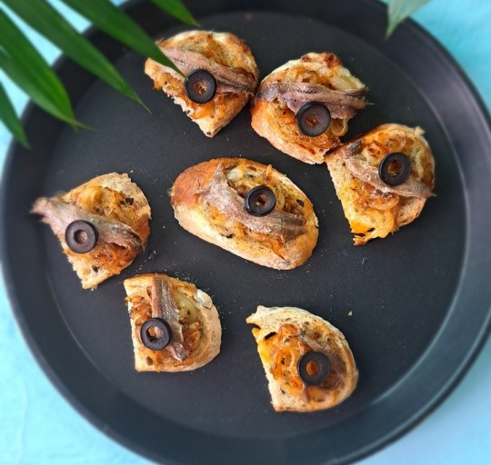 퍼프 페이스트리 또는 피자 도우 1장(구입 또는 수제), 얇게 썬 큰 양파 4개, 올리브유 2큰술, 설탕 1작은술, 취향에 따라 소금과 후추, 씨를 빼고 반으로 자른 블랙 올리브(니수아즈 올리브가 좋음) 10-15개, 8-10 멸치 필레, 장식용 신선한 백리향 잎(선택 사항)